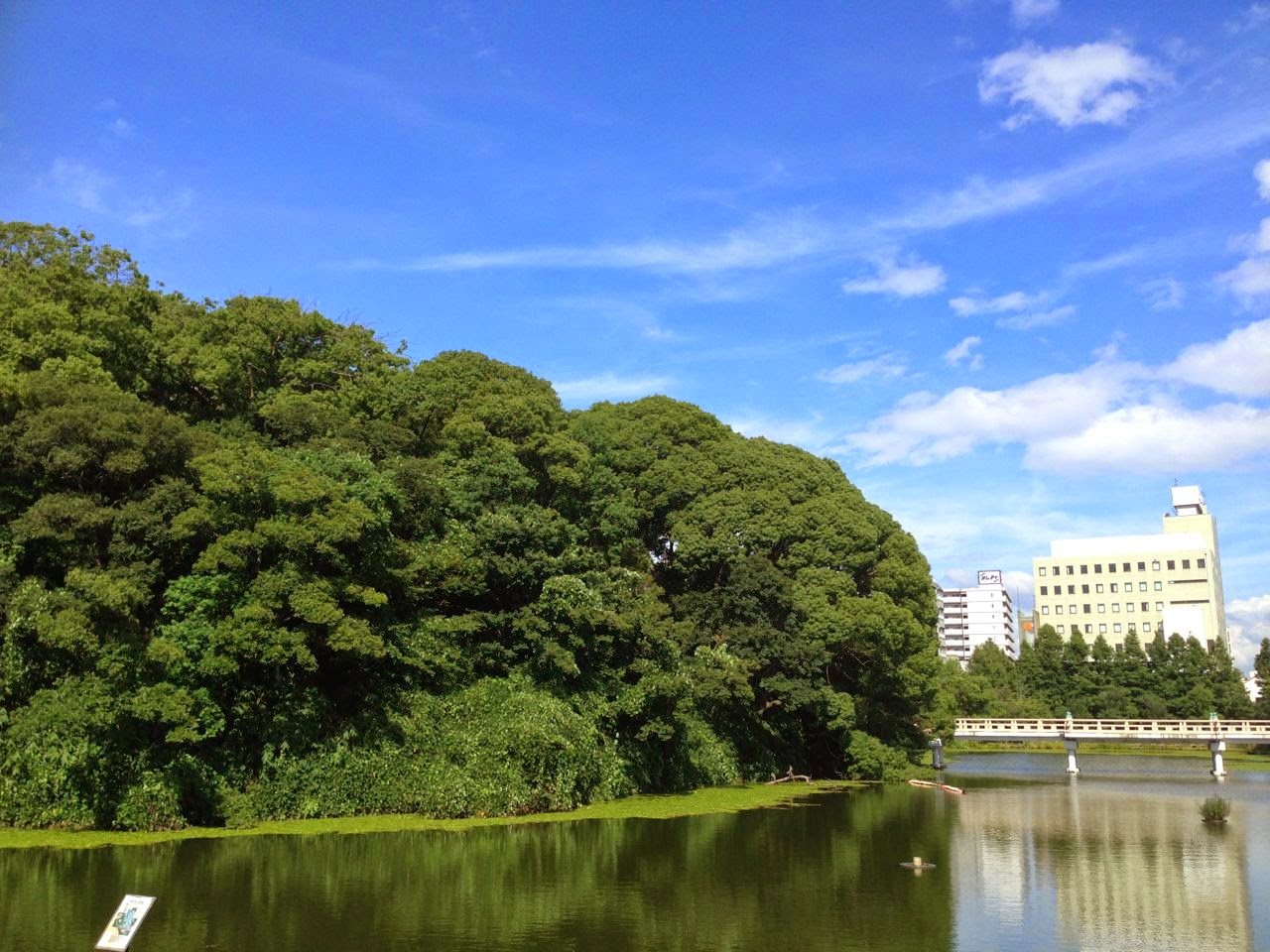 この池は「河底池」。茶臼山に架かる橋は「和気橋」。和気清麻呂が旧大和川の流れを変えるために上町台地を開削した際、古墳の濠を利用した名残だそうじゃ。
